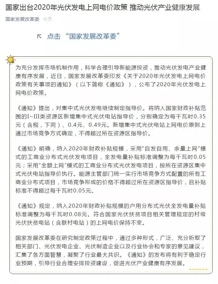 2020年4月2日,国家发改委在官方微信上,《关于2020年光伏发电上网电价政策有关事项的通知》(以下简称《通知》),公布了2020年光伏发电上网电价政策。
